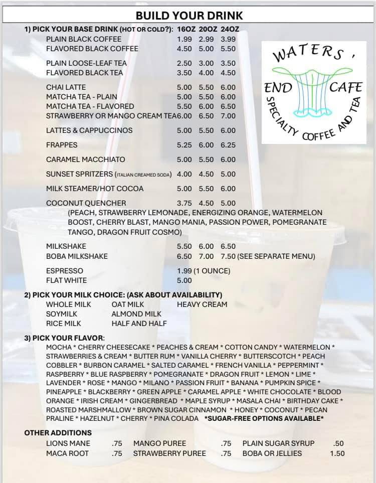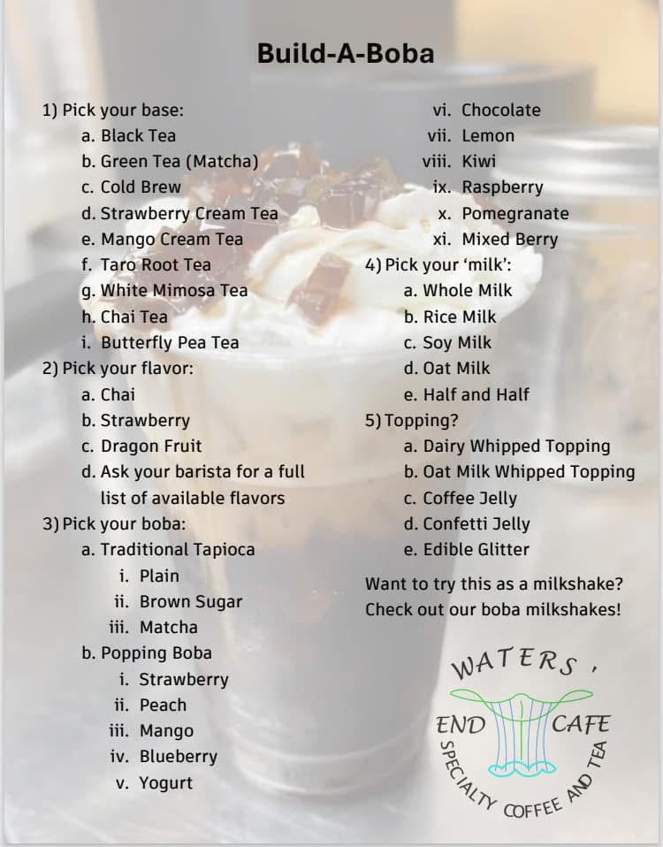 At Waters End Cafe, we offer a variety of flavors ranging from our boba, milkshakes, typical coffee menu items.